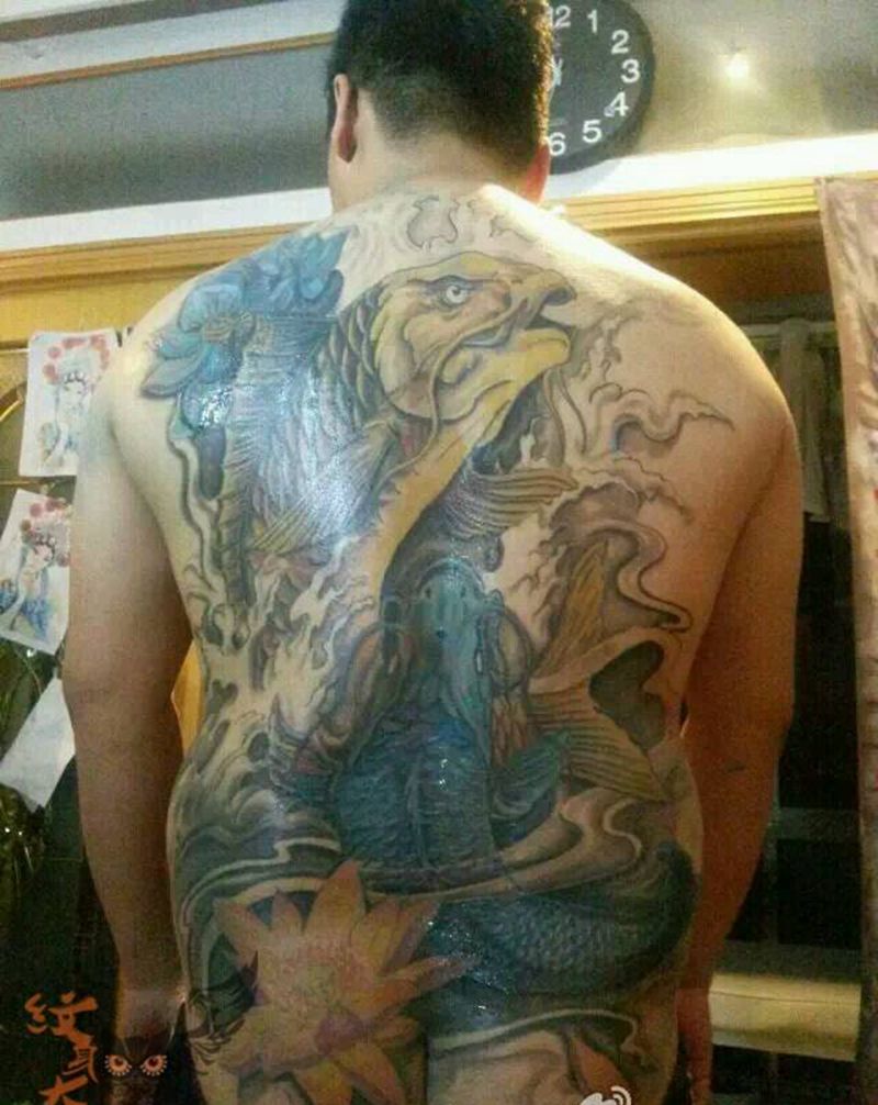 当前位置: 首页 >山东省青岛市纹身店-青岛地狱男爵刺青纹身图案>男士满背双鱼遮盖纹身图片