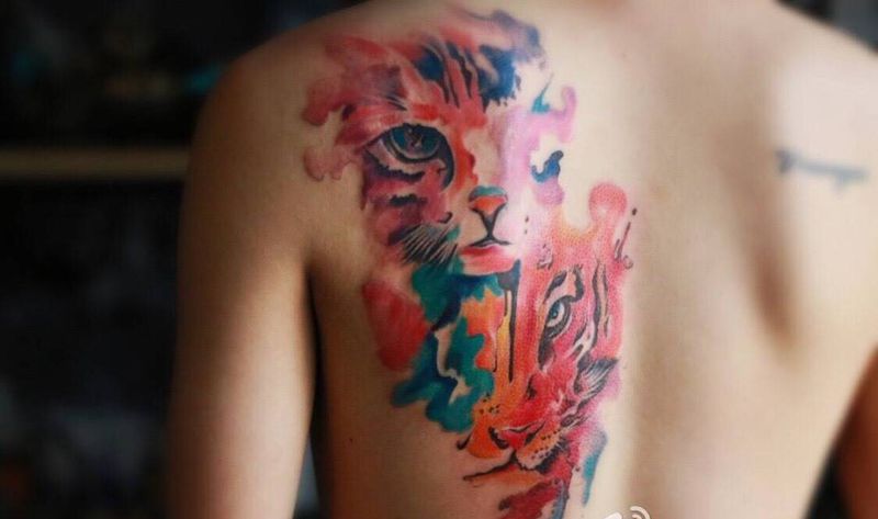 当前位置: 首页 >山东省青岛市纹身店-青岛地狱男爵刺青纹身图案>水彩风格猫虎纹身图片_成品背部欧美动物水彩青岛文身黄岛纹身图案