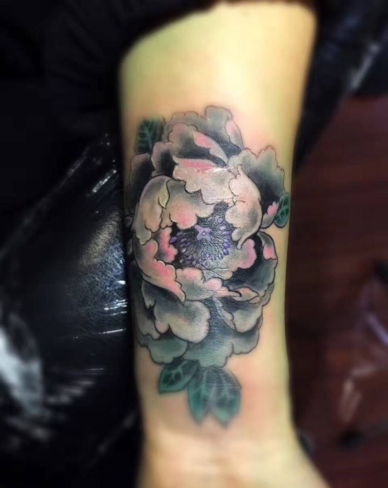 小臂牡丹纹身图片_成品手臂传统植物黄岛青岛刺青青岛牡丹纹身图案