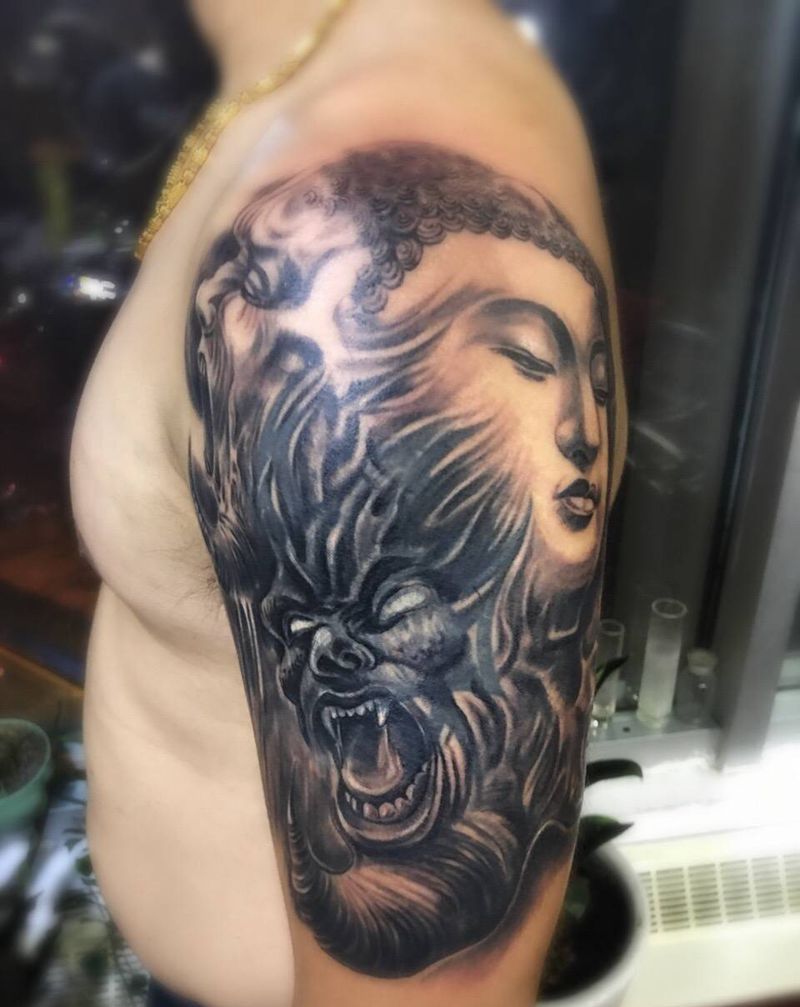 遮盖纹身图片_成品肩部传统鬼神人物黄岛青岛刺青青岛佛遮盖纹身图案