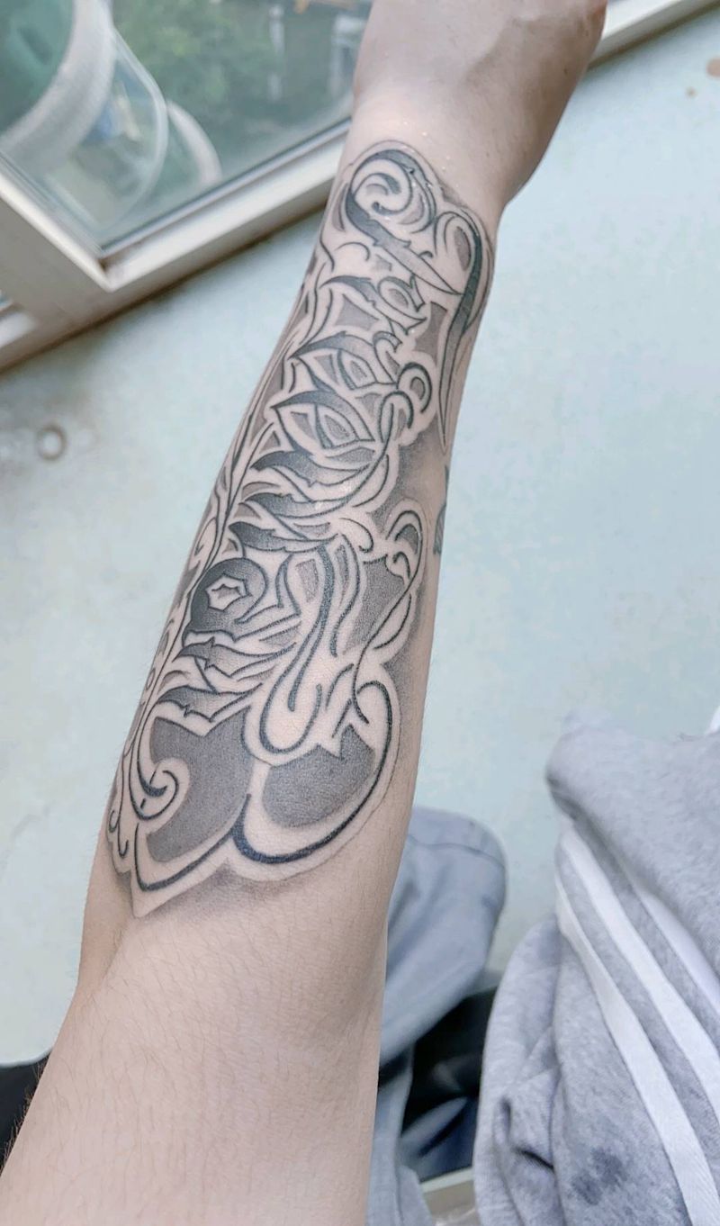 花体字恢复后纹身图片_手部手臂花体字纹身图案
