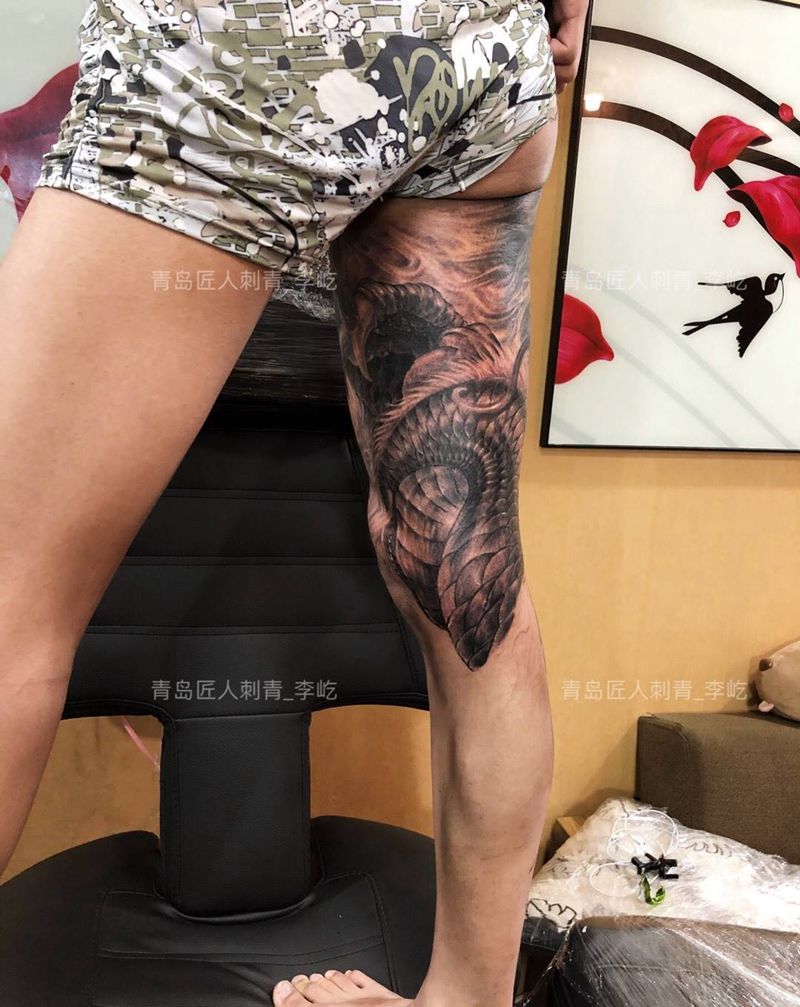 • T网红王老大花腿龙纹身图片_腿部新传统纹身图案