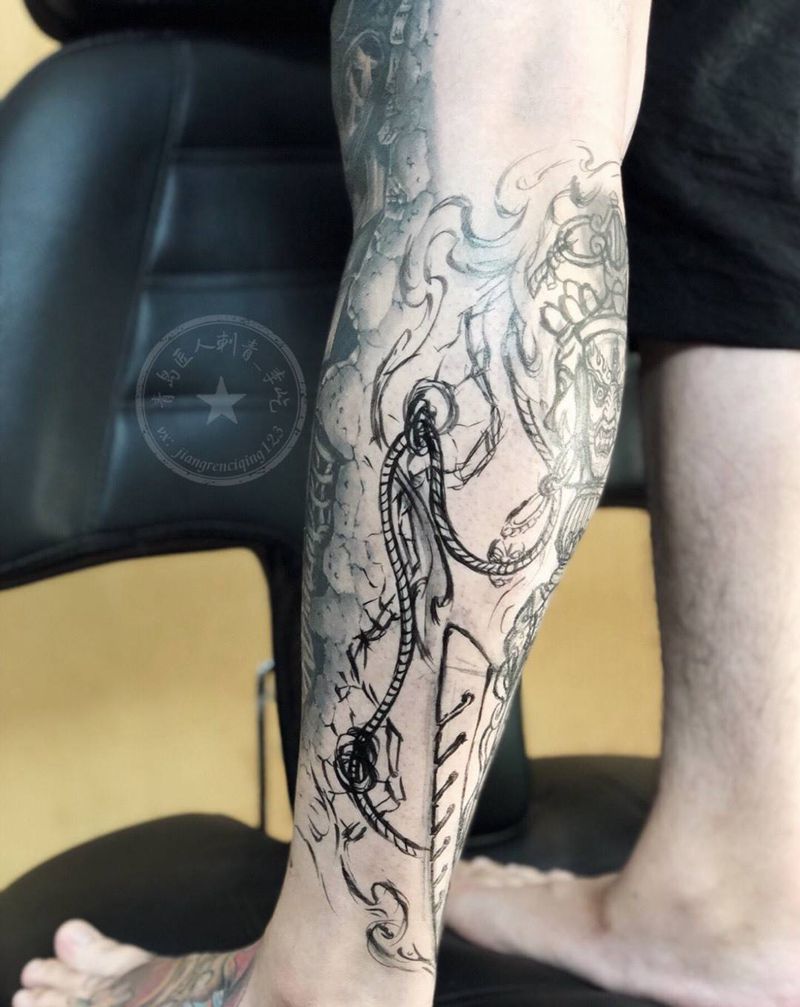 降魔杵 小腿纹身图片_成品腿部传统写实鬼神原创纹身图案