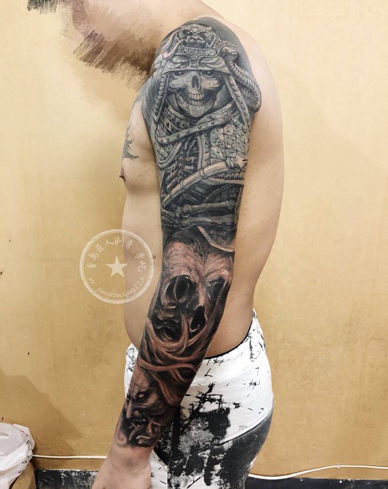 当前位置: 首页 >山东省青岛市纹身店-匠人刺青纹身图案>遮盖过肩龙 鬼武士花臂 骷髅花臂纹身图片_成品胸部手臂传统写实人物鬼神原创纹身图案