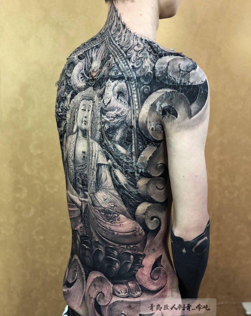 石雕燃灯古佛纹身图片_背部新传统欧美写实石雕纹身图案