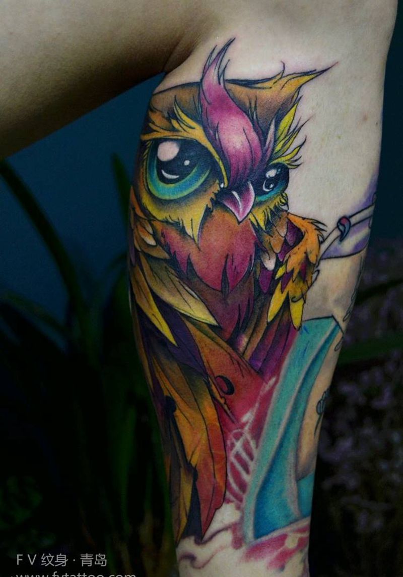 当前位置: 首页 >山东省青岛市纹身店-FV 纹身 艺术区纹身图案>小腿猫头鹰纹身图片_腿部欧美动物青岛FV纹身图案