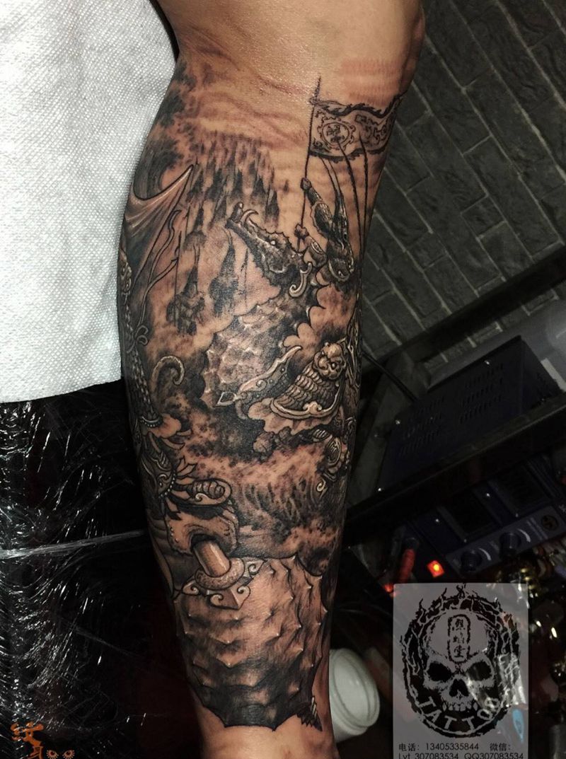 当前位置: 首页 >山东省淄博市纹身店-烈焰堂纹身纹身图案>虾兵蟹将纹身图片_成品腿部传统写实动物原创鬼神宗教纹身图案