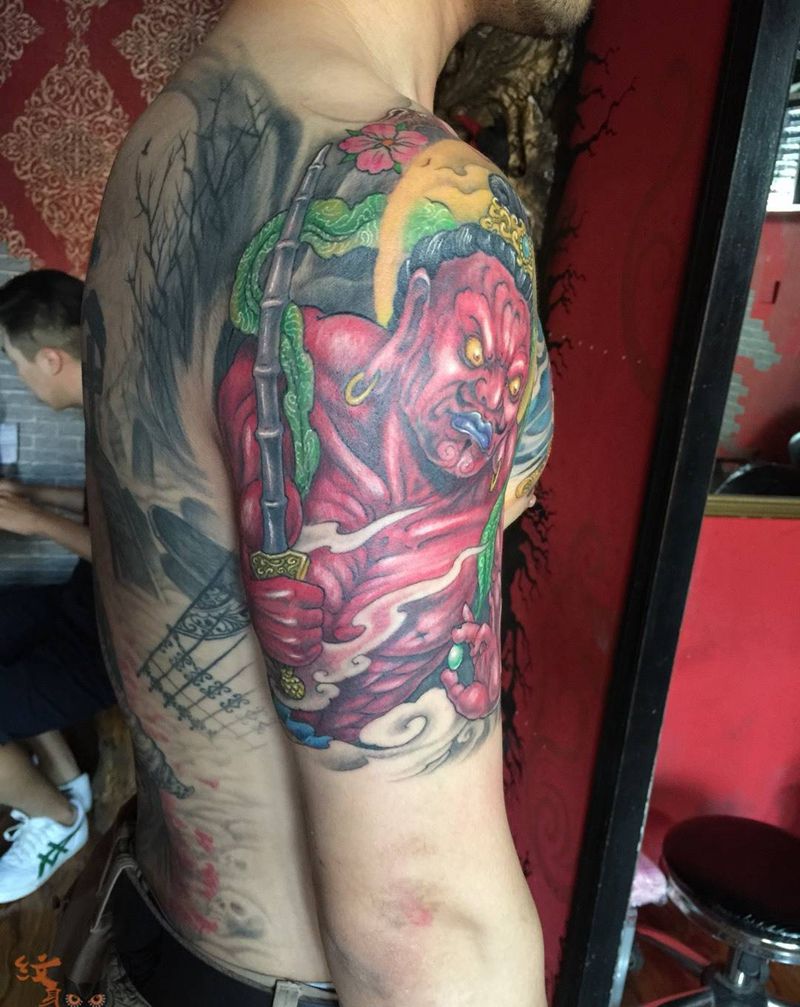 当前位置: 首页 >山东省淄博市纹身店-烈焰堂纹身纹身图案>怒相般若 怒目金刚 半甲纹身图片_成品肩部胸部手臂肖像传统原创宗教鬼神人物纹身图案