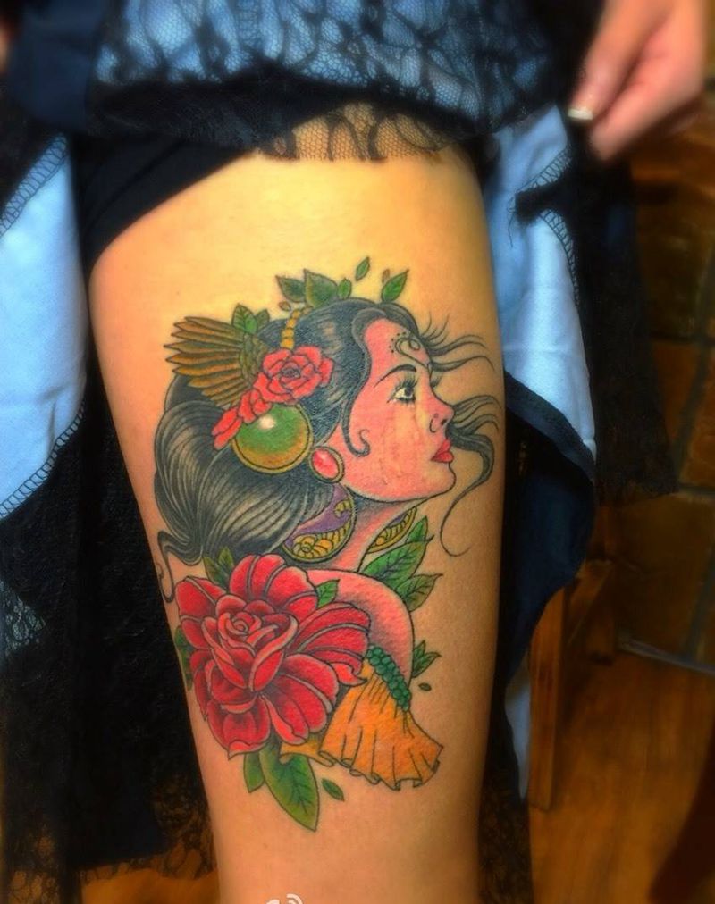 school风格美女纹身图片_成品腿部欧美人物纹身图案