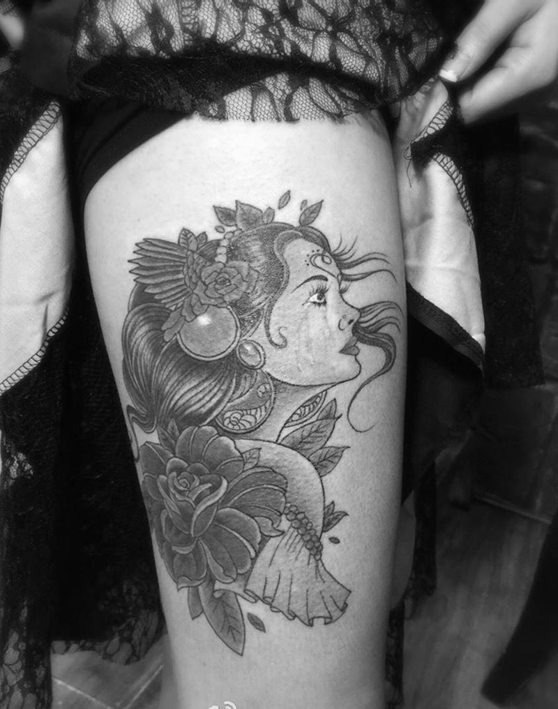 school风格美女纹身图片_成品腿部欧美人物纹身图案