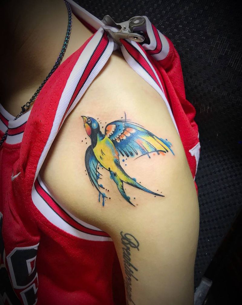 燕子纹身图片_成品传统彩色水彩风格原创动物肩部纹身图案