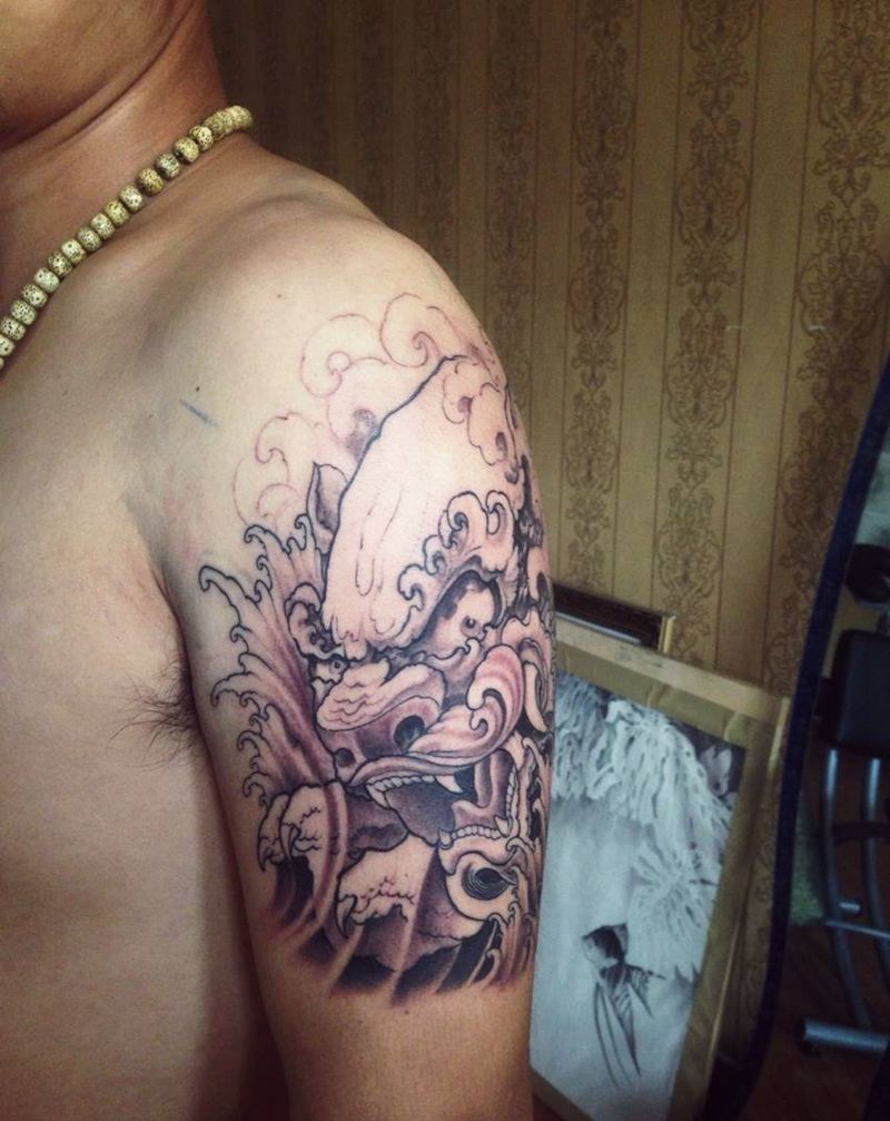 彩色唐狮子纹身图片_成品手臂传统动物纹身图案