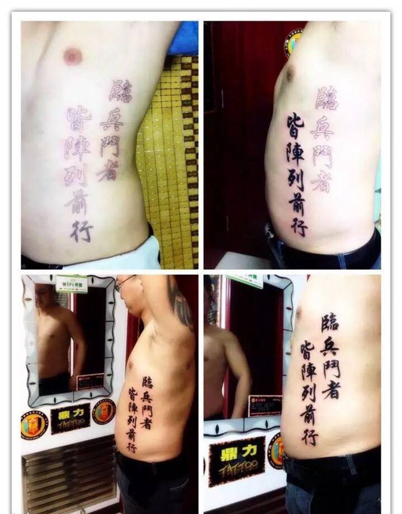 当前位置: 首页 >山东省烟台市纹身店-鼎力刺青专业纹身会所纹身图案>侧肋文字纹身图片_腰部传统字符纹身图案