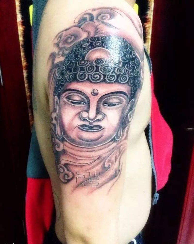 当前位置: 首页 >山东省烟台市纹身店-鼎力刺青专业纹身会所纹身图案>大臂佛头纹身图片_成品手臂写实人物宗教纹身图案
