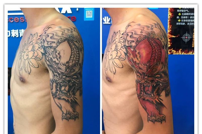 • T网红王老大花腿龙纹身图片_腿部新传统纹身图案