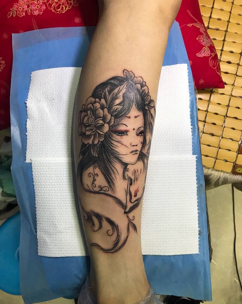小腿艺姬九尾狐纹身图片