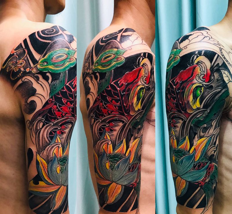 当前位置: 首页 >山东省烟台市纹身店-鼎力刺青专业纹身会所纹身图案>DL 大臂遮盖纹身图片_手臂胸部老传统纹身图案