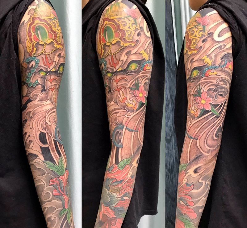 当前位置: 首页 >山东省烟台市纹身店-鼎力刺青专业纹身会所纹身图案>DL 衔接花臂打雾纹身图片_手臂老传统纹身图案