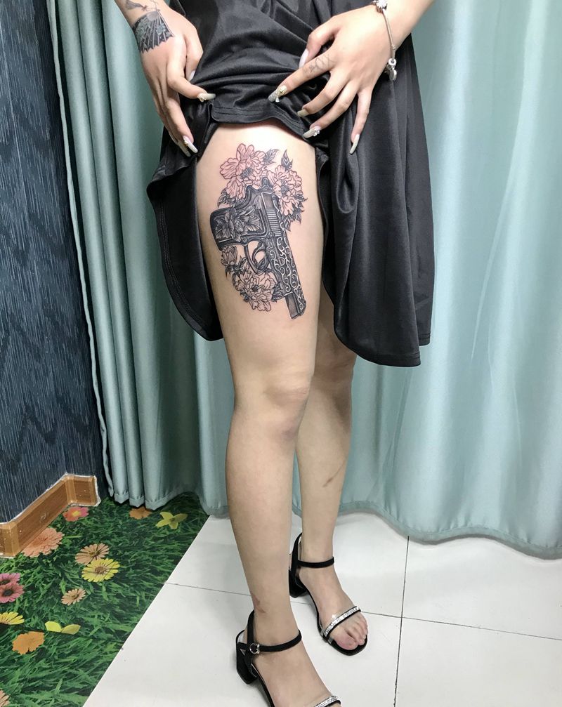 DL 大腿枪加牡丹纹身图片_腿部新传统纹身图案