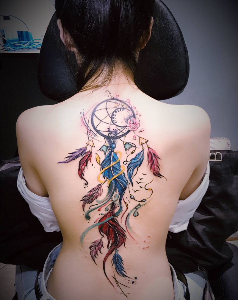 捕梦网纹身图片_背部水彩水墨羽毛捕梦网纹身图案