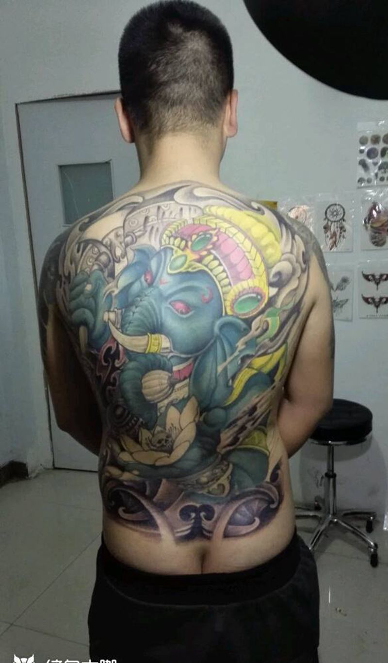 当前位置: 首页 >山东省烟台市纹身店-墨华刺青纹身图案>彩色象神未完,下次结束纹身图片