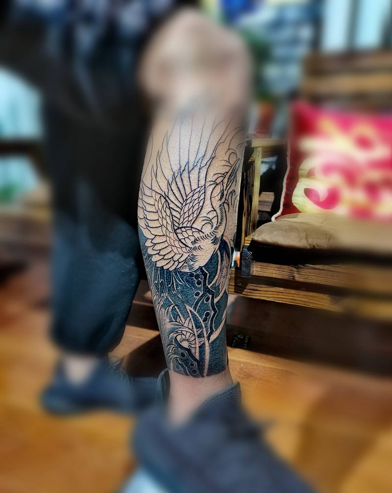 小仙鹤素材包小腿纹身图片_腿部新传统纹身图案