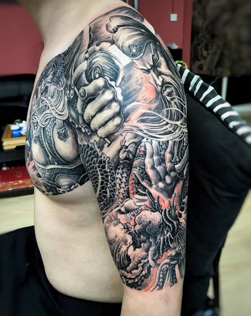 刀马半胛纹身图片_成品胸部肩部传统人物纹身图案