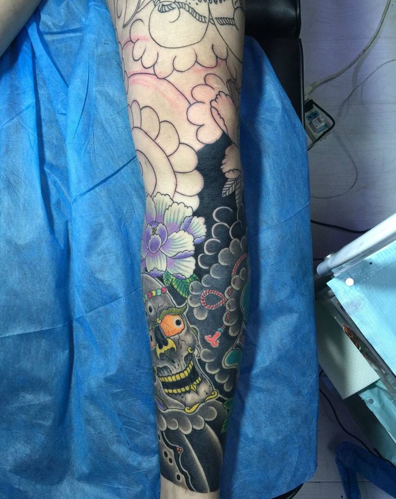 当前位置: 首页 >山东省烟台市纹身店-雷公堂刺青纹身图案>传统花腿进程纹身图片