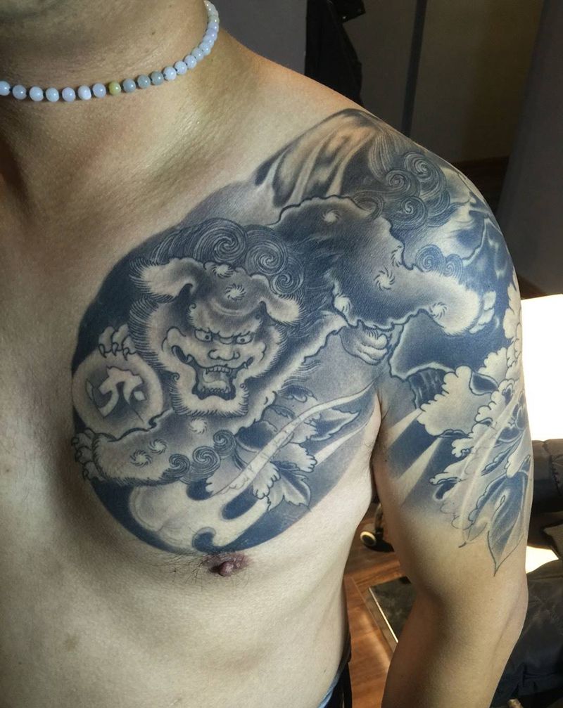 当前位置: 首页 >山东省烟台市纹身店-雷公堂刺青纹身图案>唐狮半甲。纹身图片