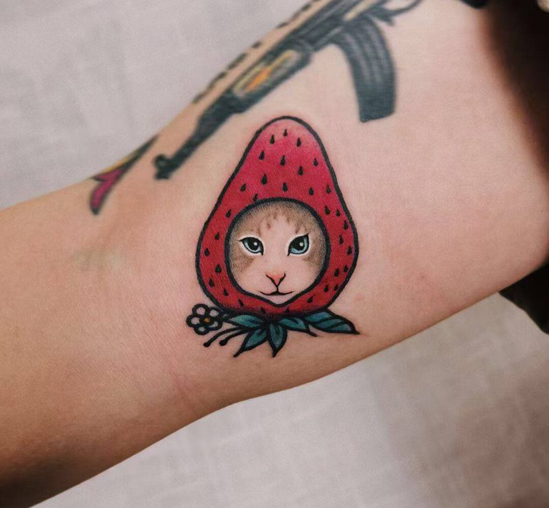当前位置: 首页 >山东省潍坊市纹身店-青刺青工作室纹身图案>顾客家的小猫咪纹身图片_手臂Old School纹身图案