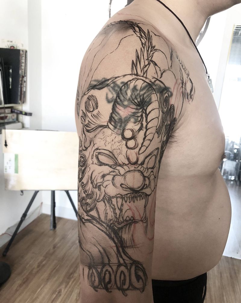 当前位置: 首页 >山东省潍坊市纹身店-山东伟刺青纹身图案>遮盖貔貅纹身图片_手臂新传统纹身图案