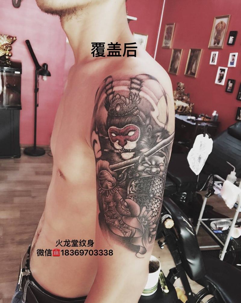 当前位置: 首页 >山东省济宁市纹身店-火龙堂纹身纹身图案>覆盖大臂狼头纹身图片