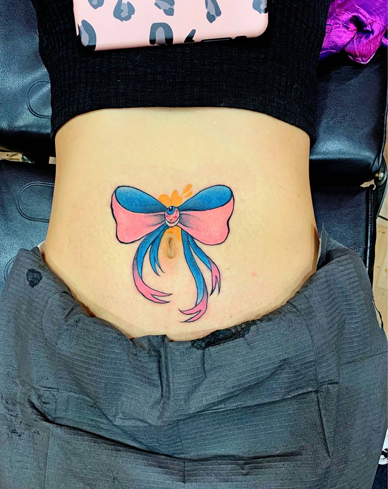 当前位置: 首页 >山东省济宁市纹身店-火龙堂纹身纹身图案>肚脐蝴蝶结纹身图片_腹部纹身图案