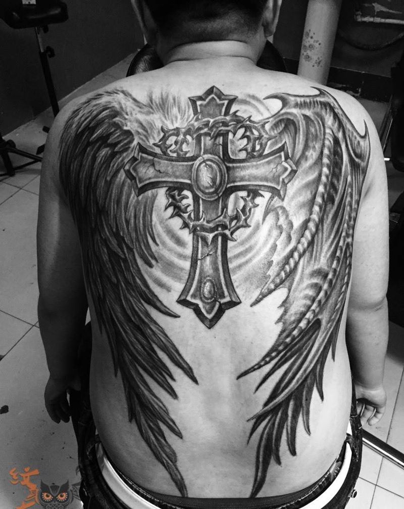 翅膀十字架纹身图片_成品背部欧美传统宗教纹身图案