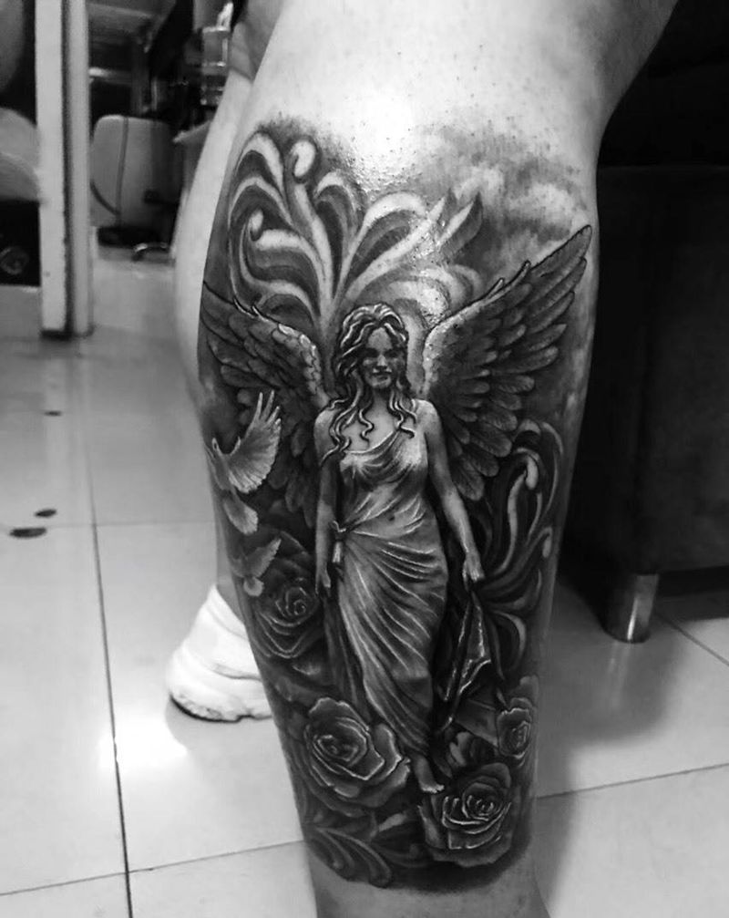 大天使风景纹身图片_成品腿部欧美肖像写实人物宗教植物原创纹身图案