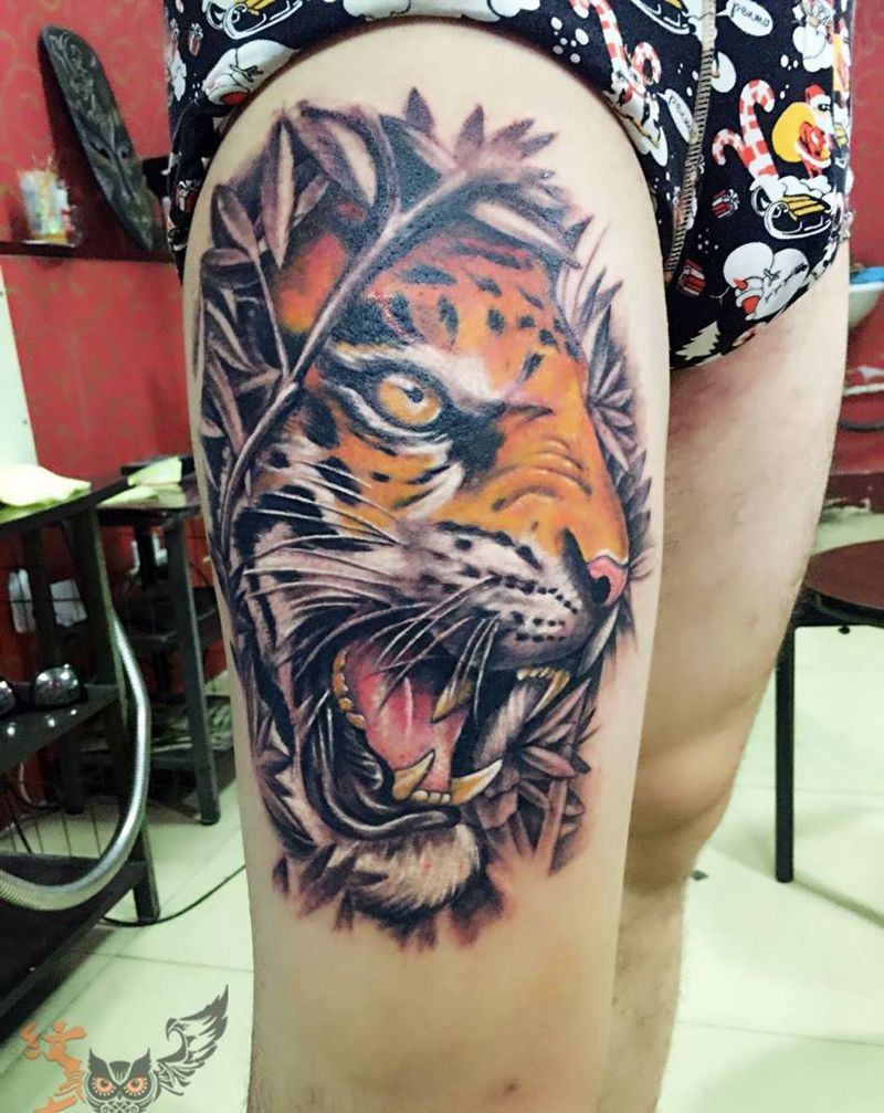 当前位置: 首页 >山东省济宁市纹身店-东龙纹身纹身图案>写实虎头纹身图片_腿部欧美动物写实成品纹身图案
