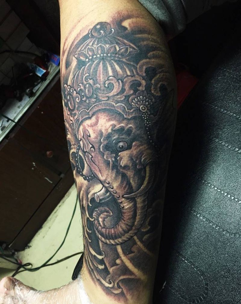当前位置: 首页 >山东省济宁市纹身店-东龙纹身纹身图案>小腿象神纹身图片_成品腿部习俗传统动物纹身图案