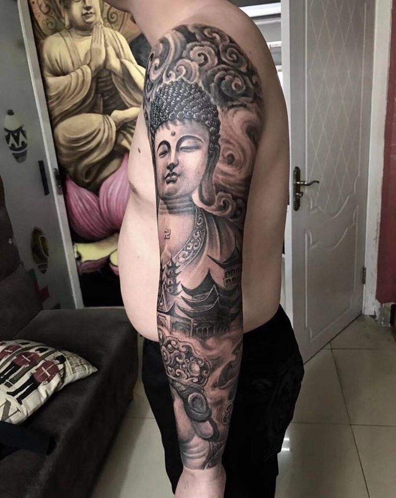 大日如来普贤菩萨花臂纹身图片_成品肩部传统肖像人物纹身图案