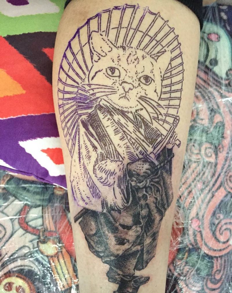 猫武士 点刺纹身图片_成品腿部欧美纹身图案