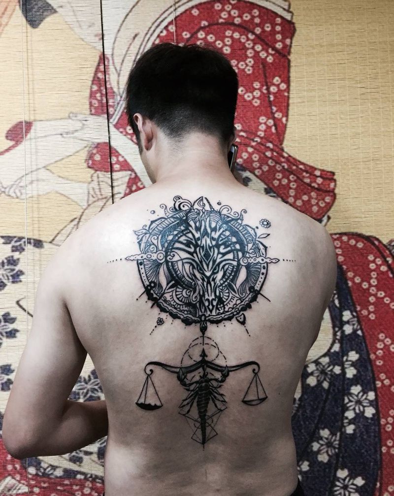 当前位置: 首页 >山东省威海市纹身店-鞭挞刺青纹身图案>图腾镶嵌手绘图案+天蝎座。纹身图片_成品背部习俗清新动物字符宗教纹身图案