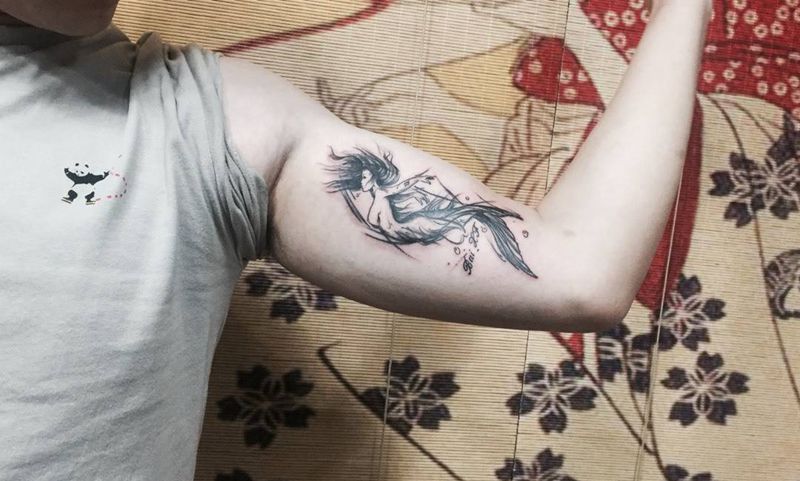 当前位置: 首页 >山东省威海市纹身店-鞭挞刺青纹身图案>大臂里的美人鱼纹身图片_成品手臂习俗人物动物字符纹身图案