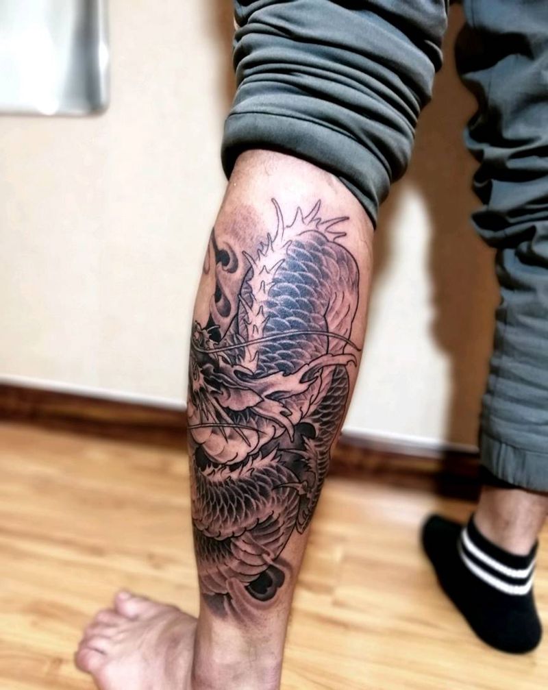 小腿龙纹身图片_腿部新传统龙纹身图案