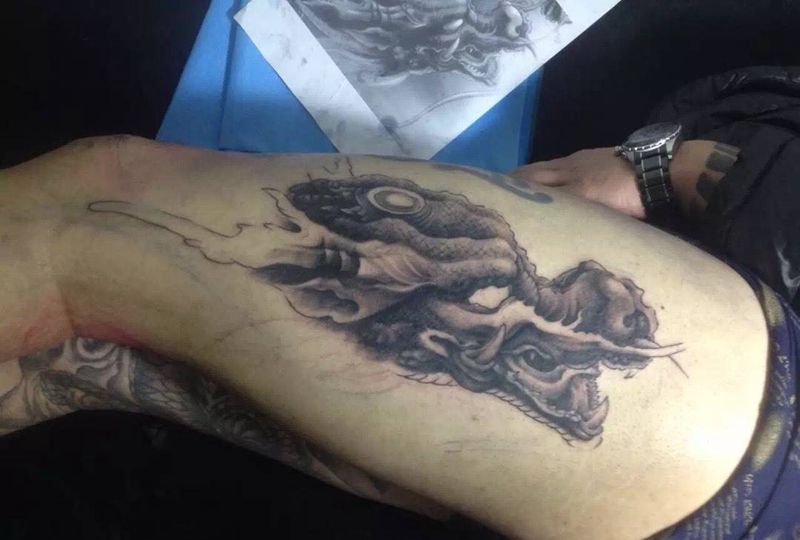 • T网红王老大花腿龙纹身图片_腿部新传统纹身图案
