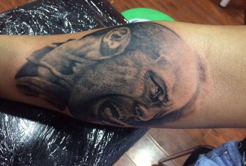 • T包小腿吹火男+阿多福纹身图片_腿部老传统新传统吹火男阿