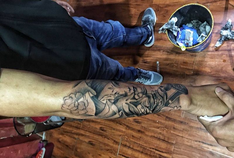 • T包小腿吹火男+阿多福纹身图片_腿部老传统新传统吹火男阿