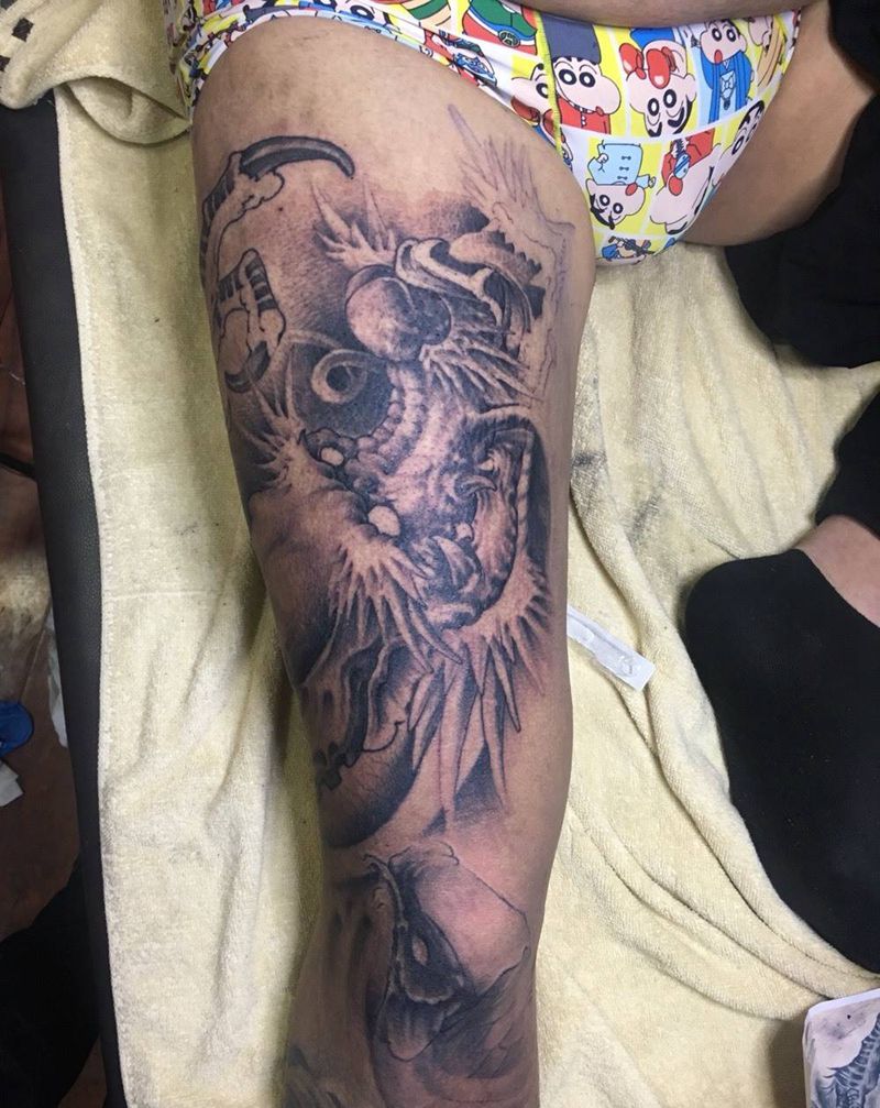 • T网红王老大花腿龙纹身图片_腿部新传统纹身图案