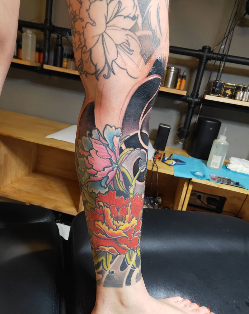 当前位置: 首页 >山东省临沂市纹身店-天刺纹身纹身图案>小腿牡丹纹身图片_老传统新传统纹身图案