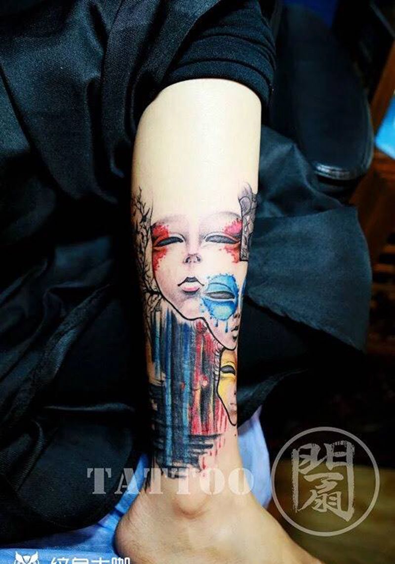 • T包小腿吹火男+阿多福纹身图片_腿部老传统新传统吹火男阿