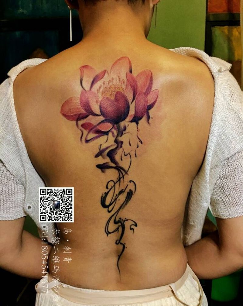 水墨莲花纹身图片_背部传统清新写实植物宗教原创成品纹身图案