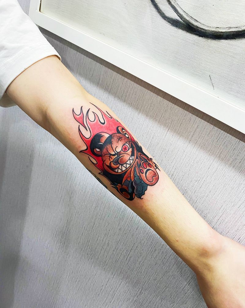当前位置: 首页 >山东省聊城市纹身店-聊城刺客纹身工作室纹身图案>流氓熊纹身图片_手臂纹身图案